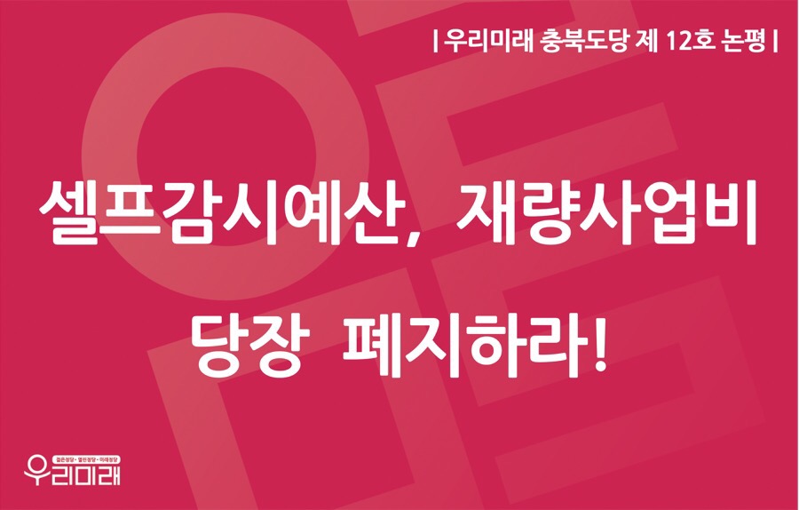 우리미래 충북도당은 이런 문제들을 가지고 있는 재량사업비에 해당하는 어떤 예산 편성도 용납할 수 없다. 청주시와 충북도, 그리고 청주시의회와 충북도의회는 지역 주민들을 우롱하는 재량사업비 편성을 당장 중단하고 폐지해야 한다.